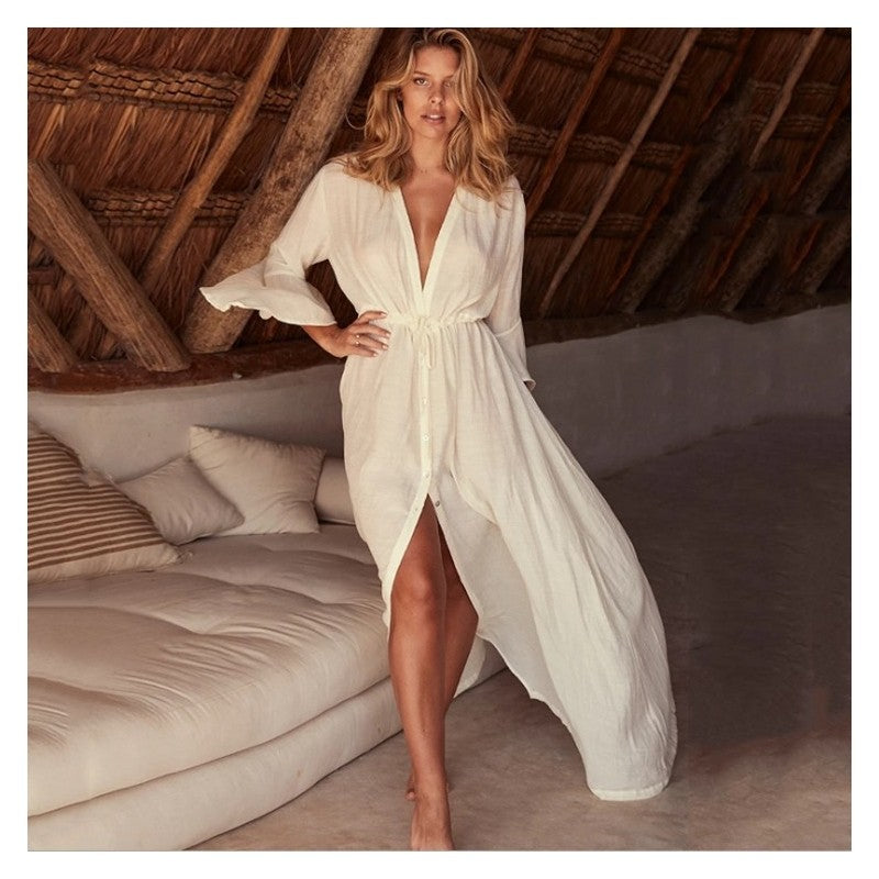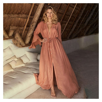 Solid Color Deep V-Neck Drawstring Maxi Dress Cover-Up