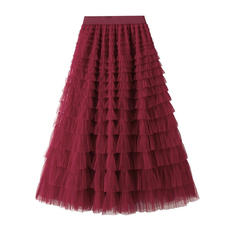 Solid Color Elastic Waist Mesh Ruffled A-Line Cake Skirts