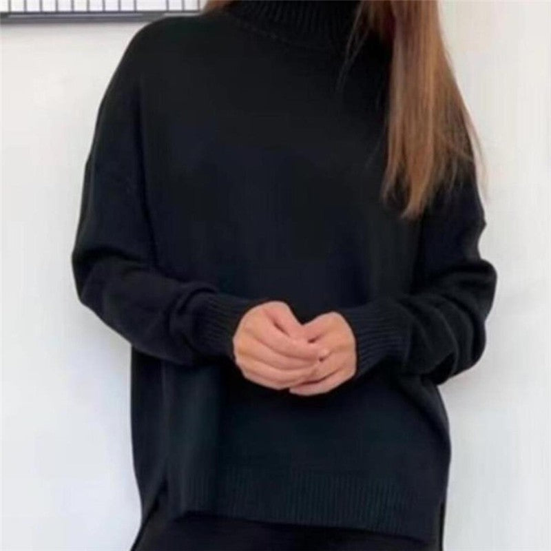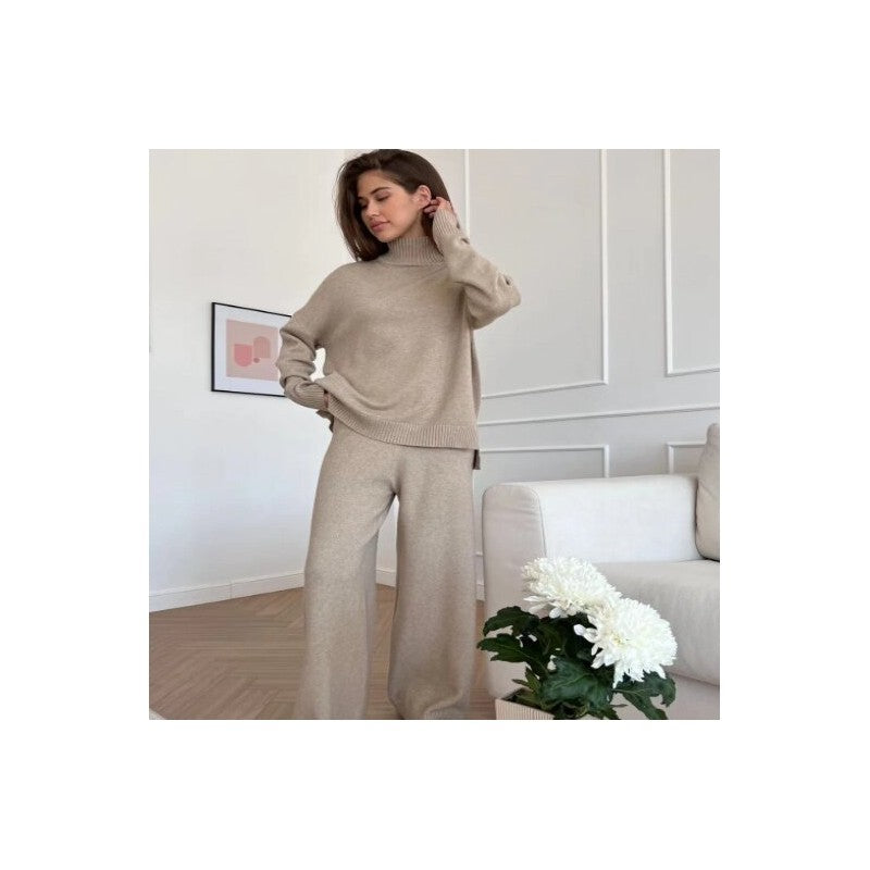 Solid Color High Neck Knit Sweater Wide Leg Pants Set