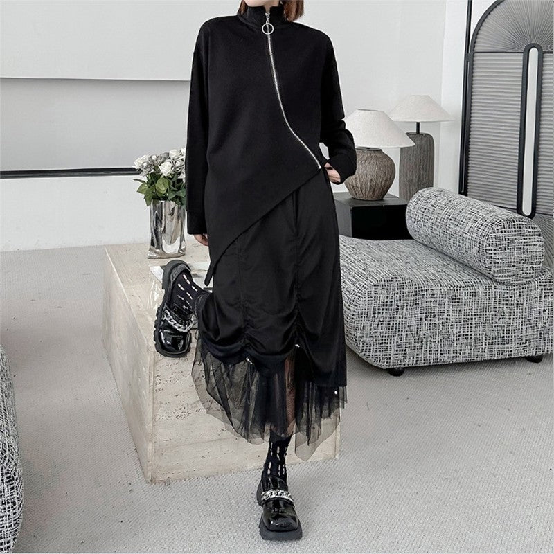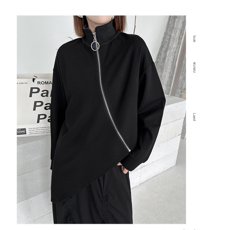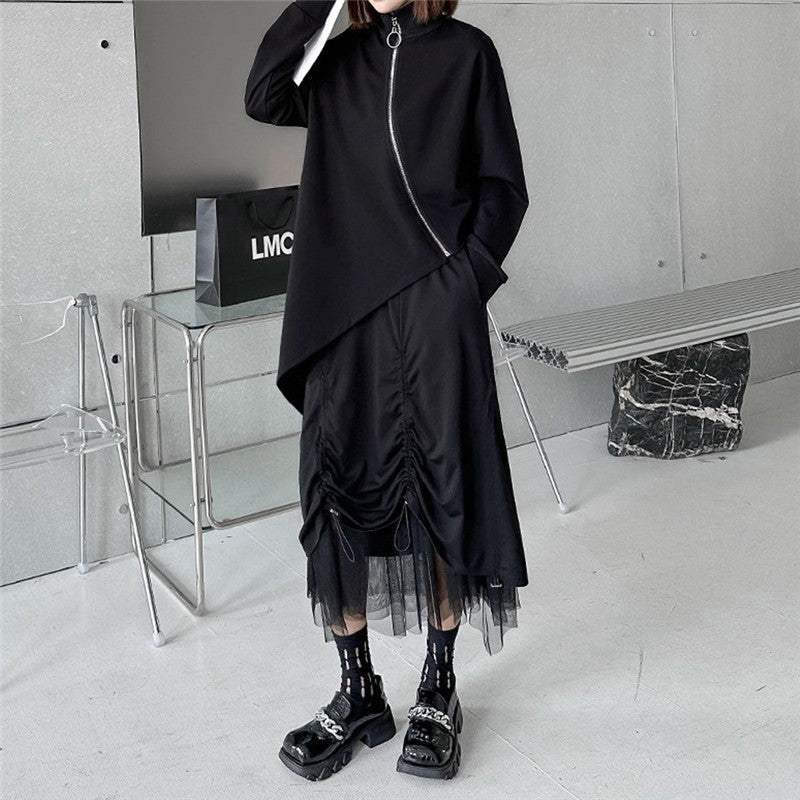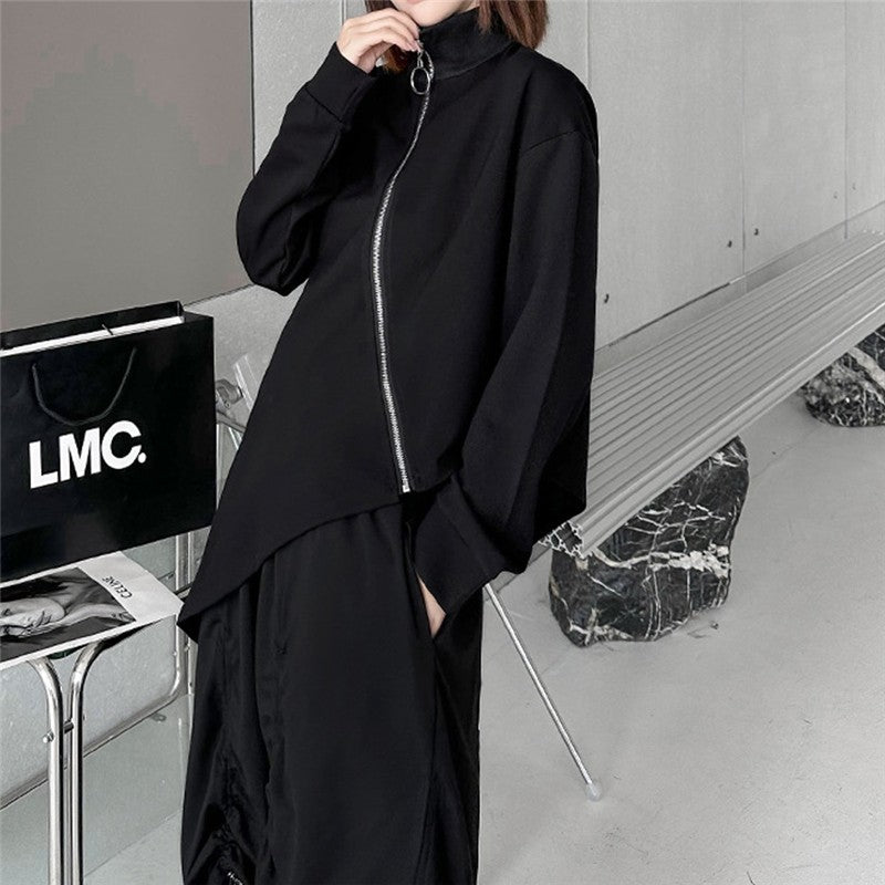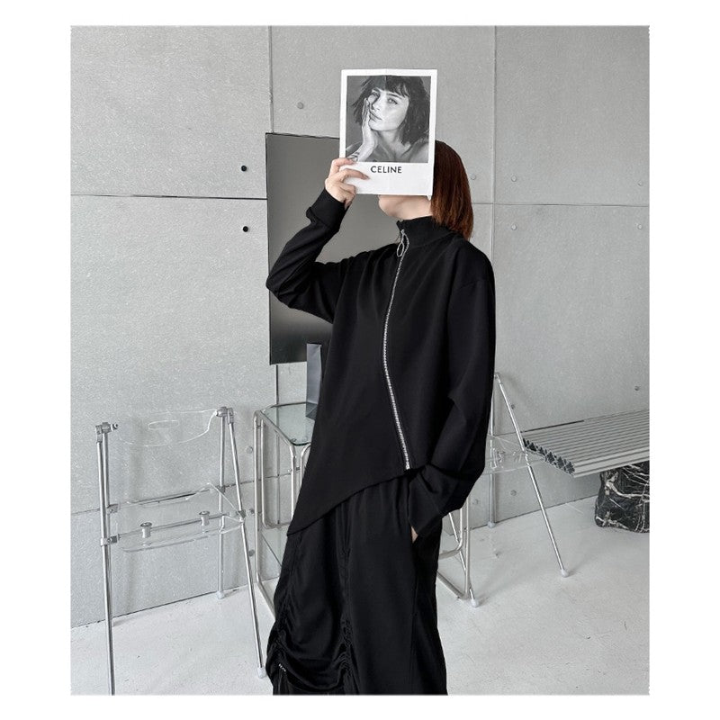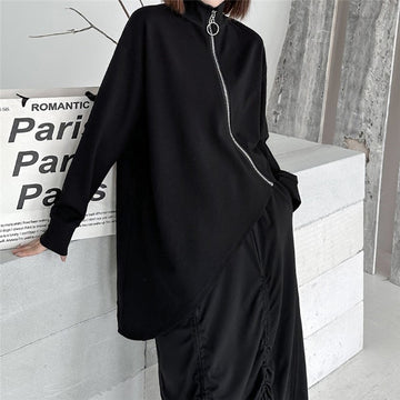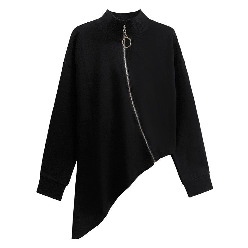 Solid Color High Neck Zipper Irregular Tshirt Top