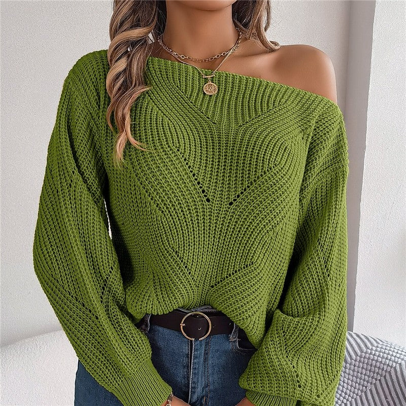 Solid Color Hollow Out One-Shoulder Lantern Sleeve Sweater