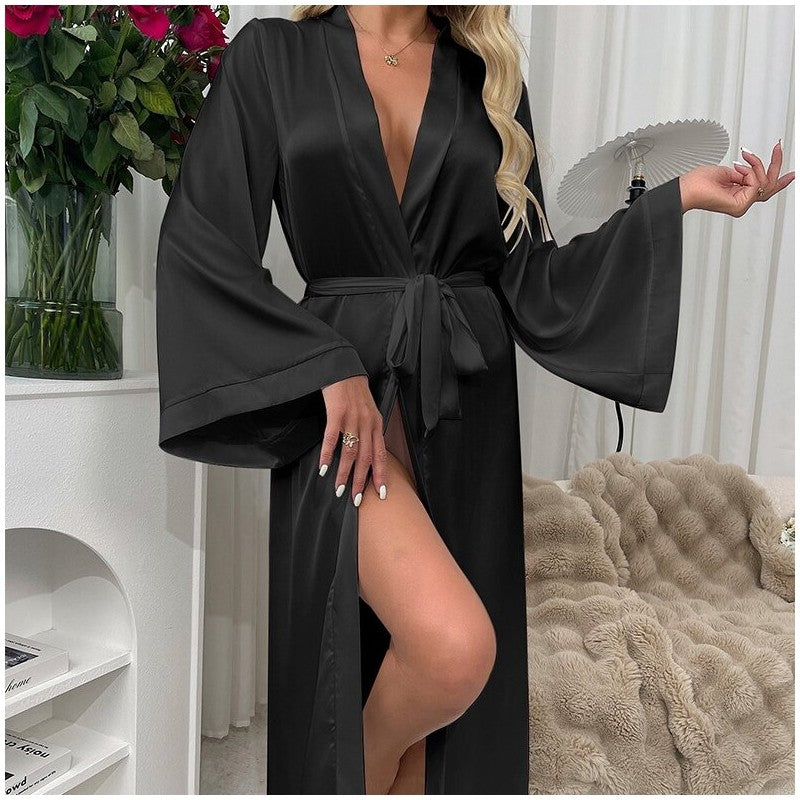 Elegant satin lace trim long sleeve robe with a cute tied waist and paneled design. Perfect for all seasons - spring, summer, autumn, and winter. Features a flattering V-neck, loose fit, and flare sleeves for ultimate comfort. Ideal as stylish home wear or loungewear.