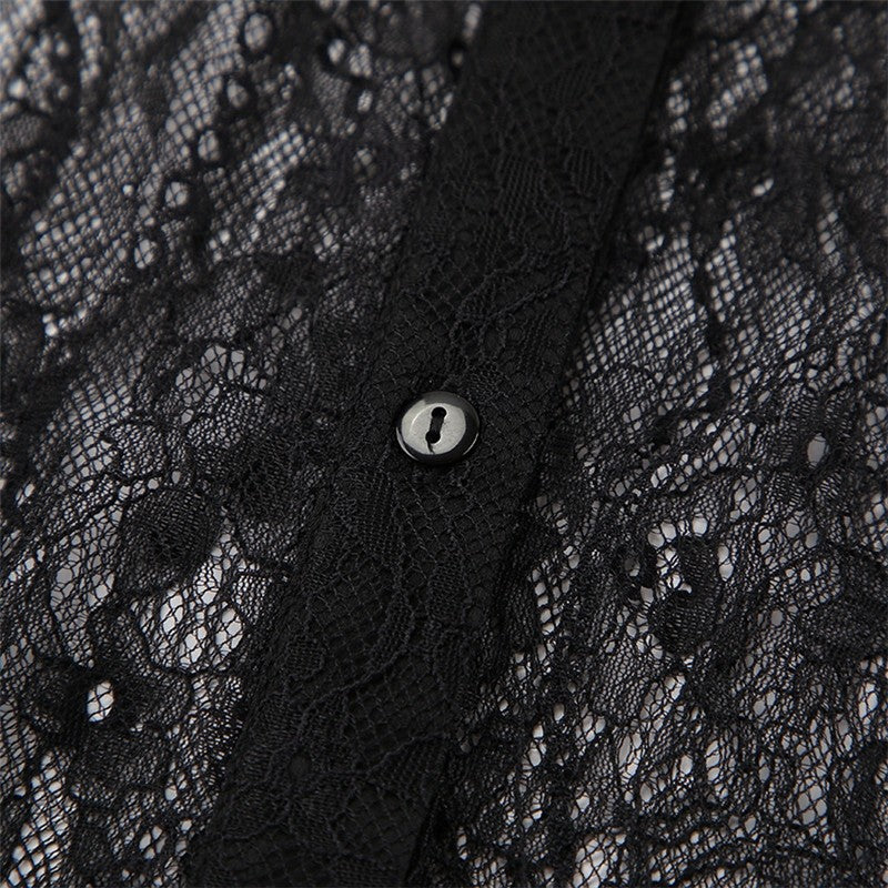 Solid Color See-Through Lace Long Sleeve Lapel Single Breasted Blouse