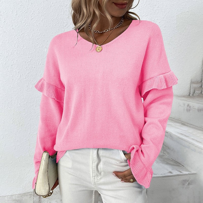 Solid Color V-Neck Petal Sleeves Knit Sweater