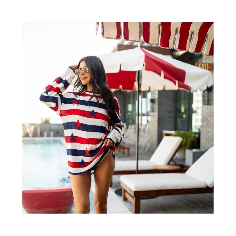 Star Print Striped Sweater Long Sleeve Loose Fit