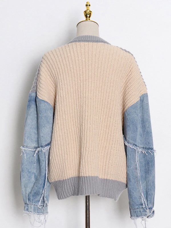 #Stylish Denim Sweater, #Contrast Color Knit Top, #Split-Joint Sweater Tops, #Loose Long Sleeve Top, #Urban Casual Sweater, #Cotton Blend Knitwear, #Going Out Sweater, #Seasonal Knit Top, #Denim Knitting Fashion, #Stylish Selection Sweater,