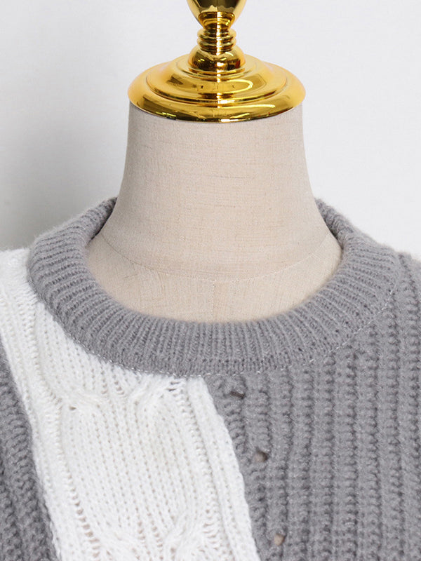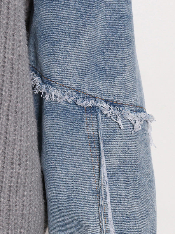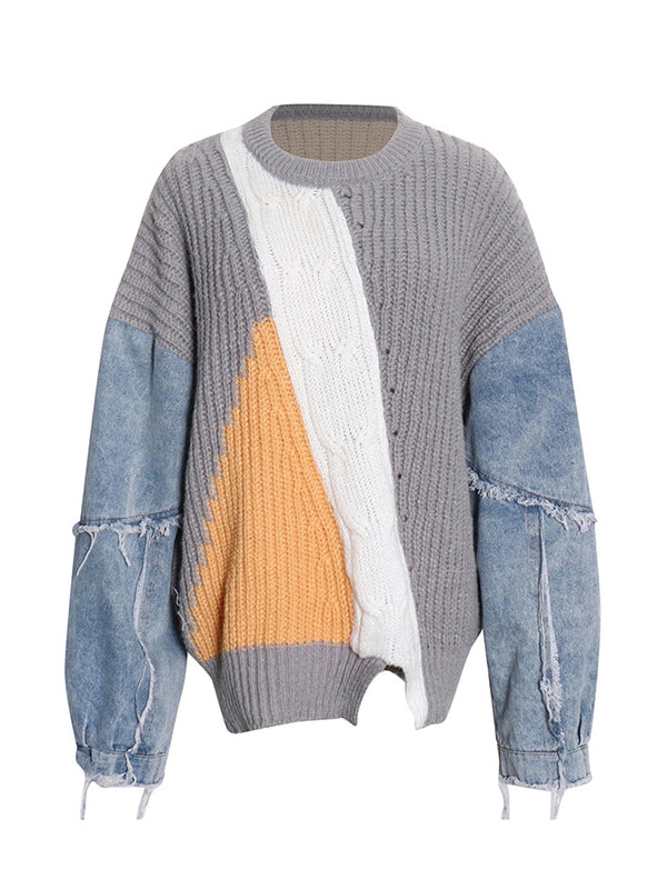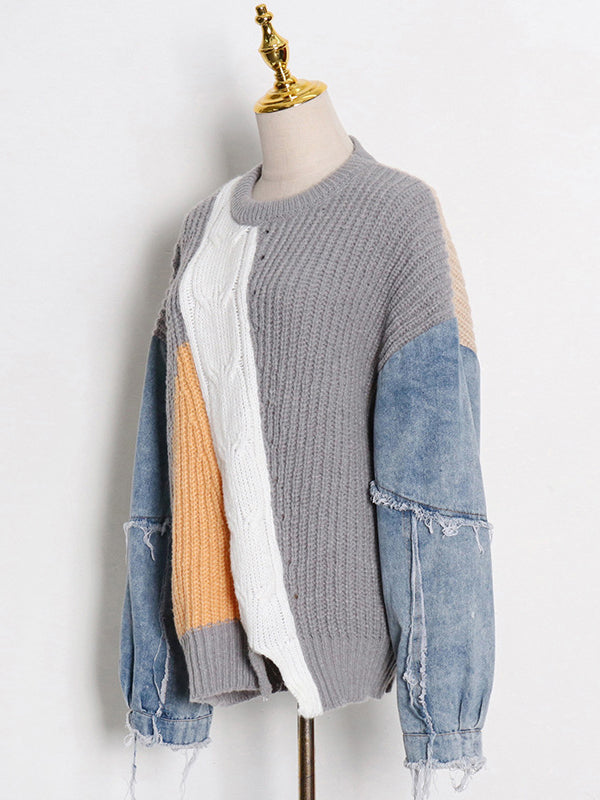 Stylish Denim Knitting Split-Joint Contrast Color Sweater Top