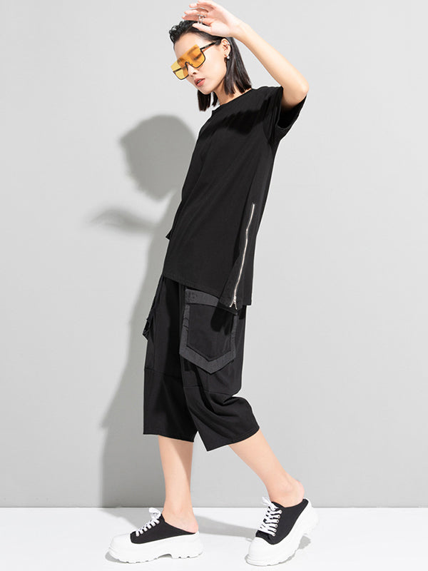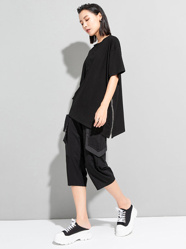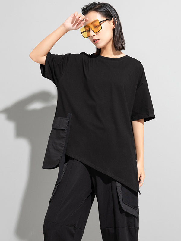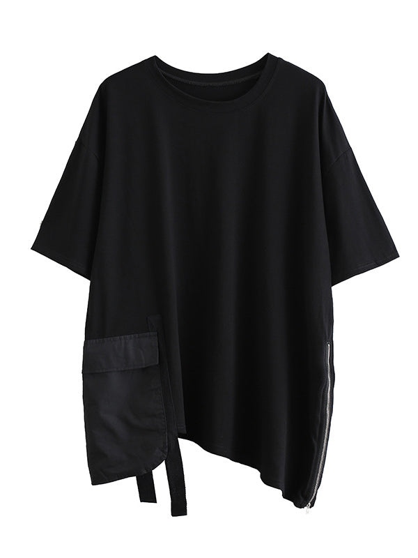 Stylish Loose Pocket Split-Joint Irregular Black T-Shirt