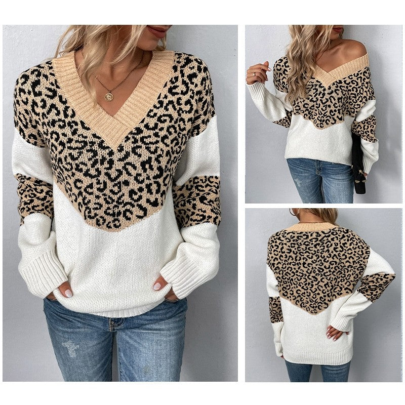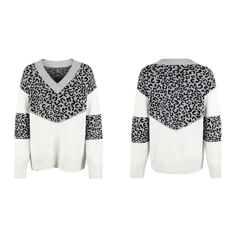 V-Neck Contrast Color Leopard-Print Knitted Sweater