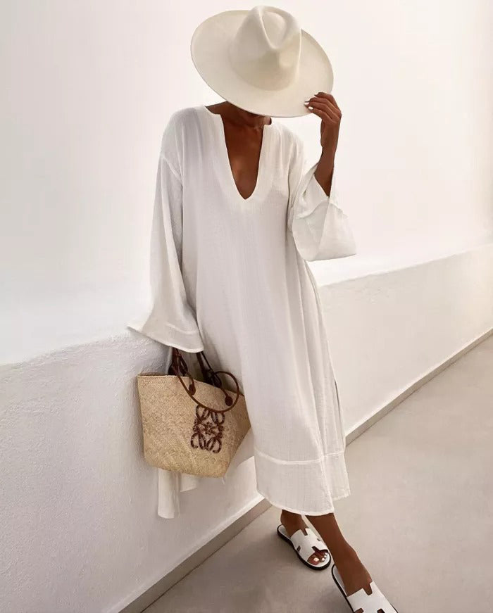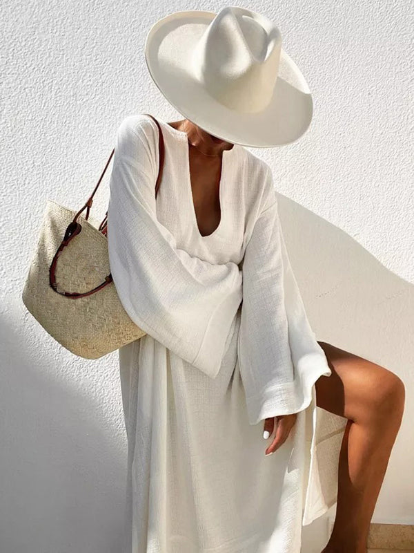 Vacation Flared Sleeves Solid Color Deep V-Neck Midi Dresses