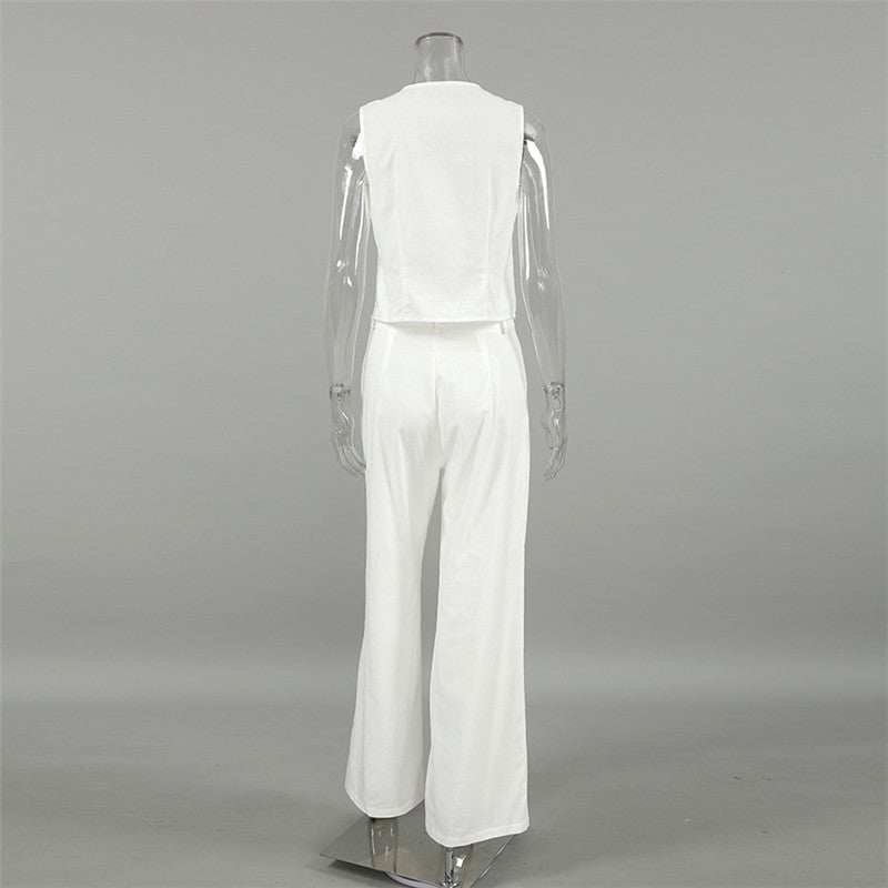 #White Linen Blend Sleeveless Blazer And Trousers Set,#Hemp Cotton Two Pieces Set,#V-neck Summer Blazer Set,#Loose Fit Office Workwear Suits,#Breathable Vacation Outfit,#Casual Beach Wear Set,#Stylish Urban Tune Fashion,#Artistic Retro Two Piece,#Girlish Sweetness Look-thin Set,#Light Maturity Leisure Fashion,